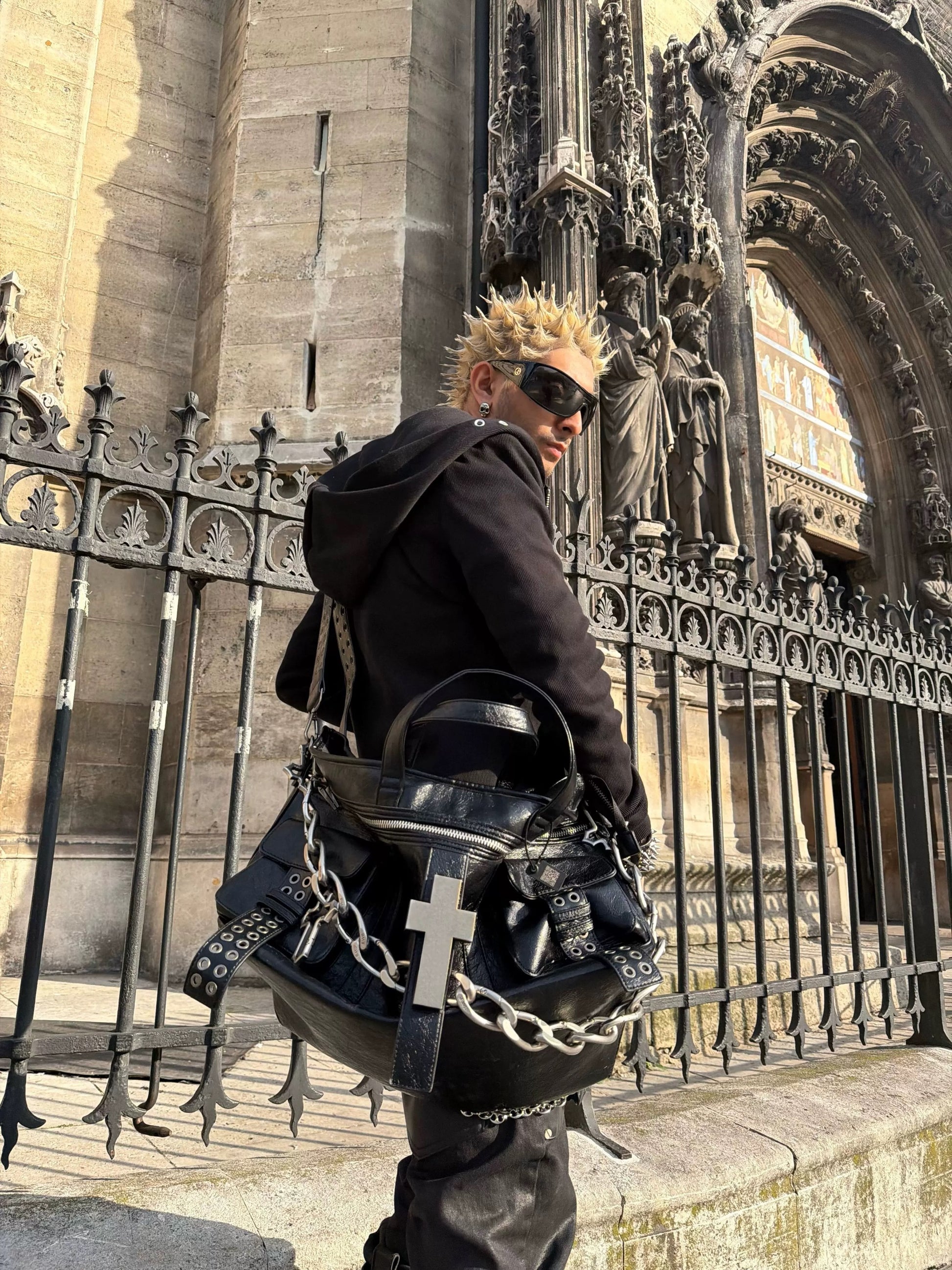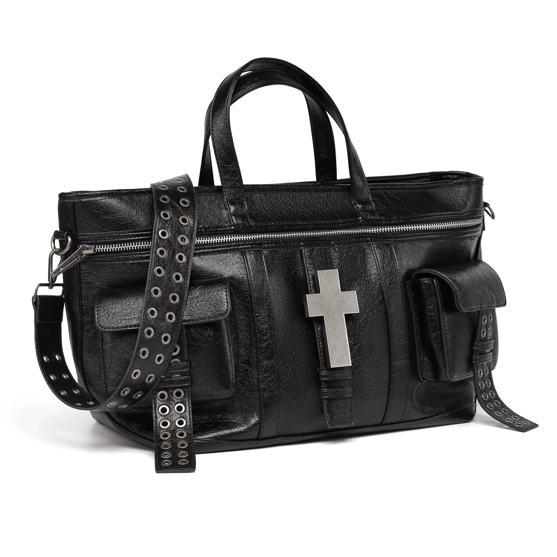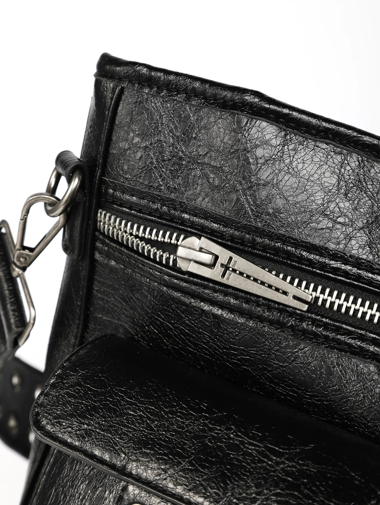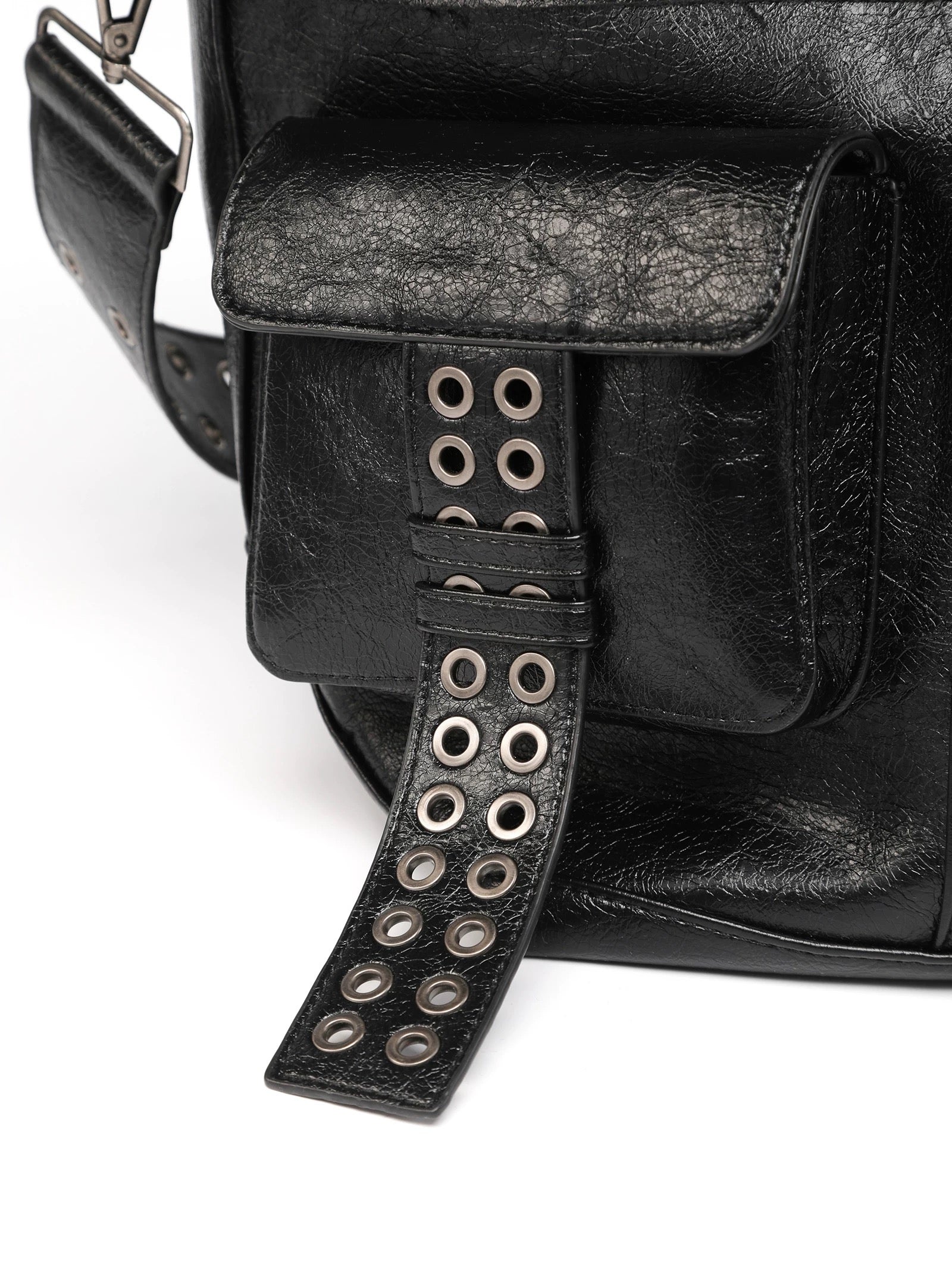 クラッシュ感のあるレザー表情と、無骨な金具ディテールが特徴の2WAYバッグ。