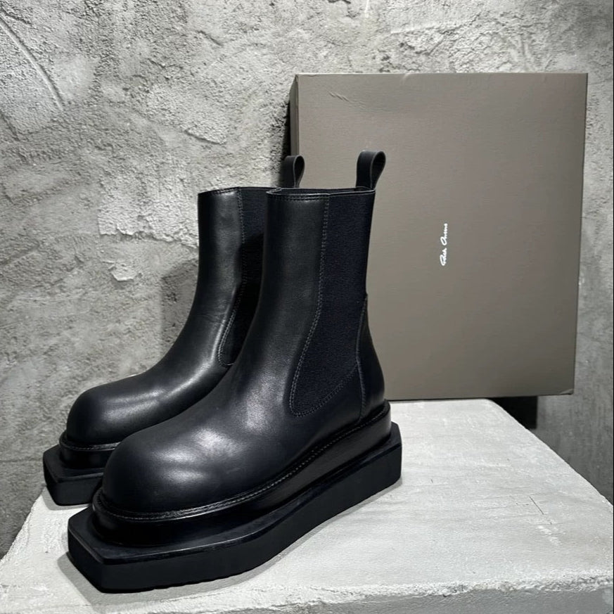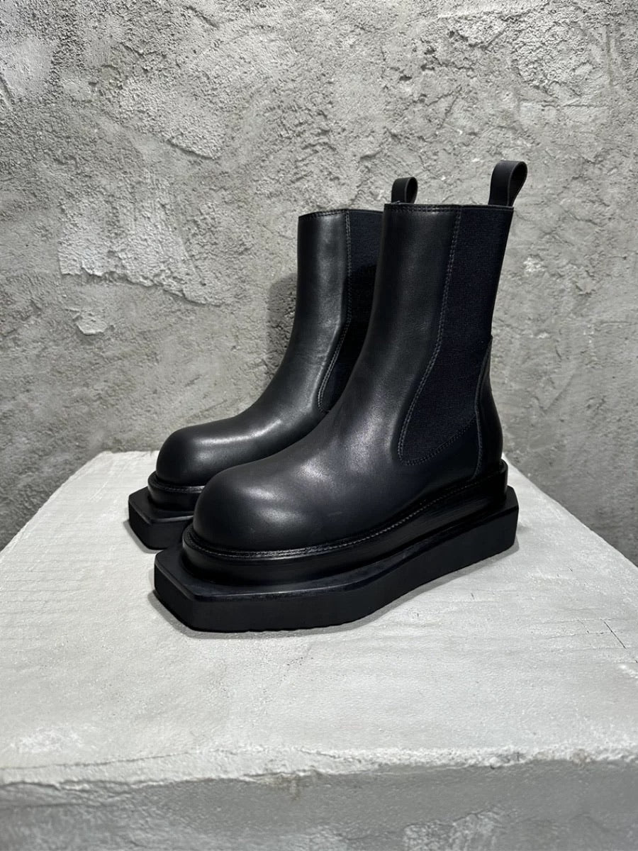 構築的なシルエットと重厚なソールが特徴の、チェルシーブーツ型モデル。